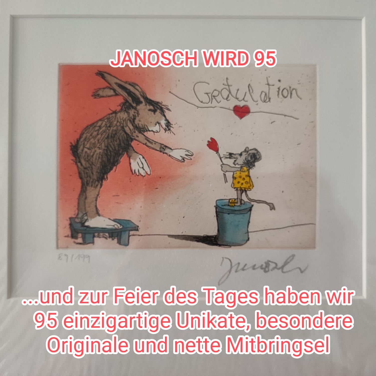 Janosch ist jetzt 92 Jahre Leider gibt es von ihm keine neuen Bilder mehr, da sein Schaffensdrang zur Ruhe gekommen ist. Wir haben das Glück, dass wir noch ein paar der letzten frei verkäuflichen Unikate präsentieren und anbieten können.
